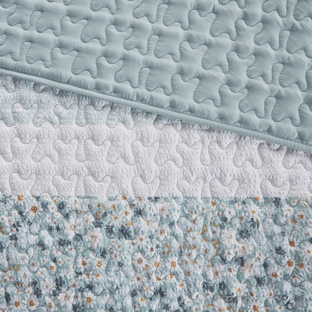 Featuring three different floral and botanical print designs with a vermicelli quilt stitch pattern, this seersucker microfiber quilt set exudes shabby chic/farmhouse style that adds a touch of elegance to any bedroom. The solid decorative pillow features gathered fabric adding to the overall charm of the set. Colors featured in this set include various shade of aqua, blue, green, yellows, and whites. The quilt and pillows are filled with hypoallergenic polyester filling that is treated to be dustproof, ensuring a restful and comfortable sleeping experience. This machine washable bedding set features an antimicrobial treatment, which inhibits bacteria growth and keeps the bedding fresher for longer.