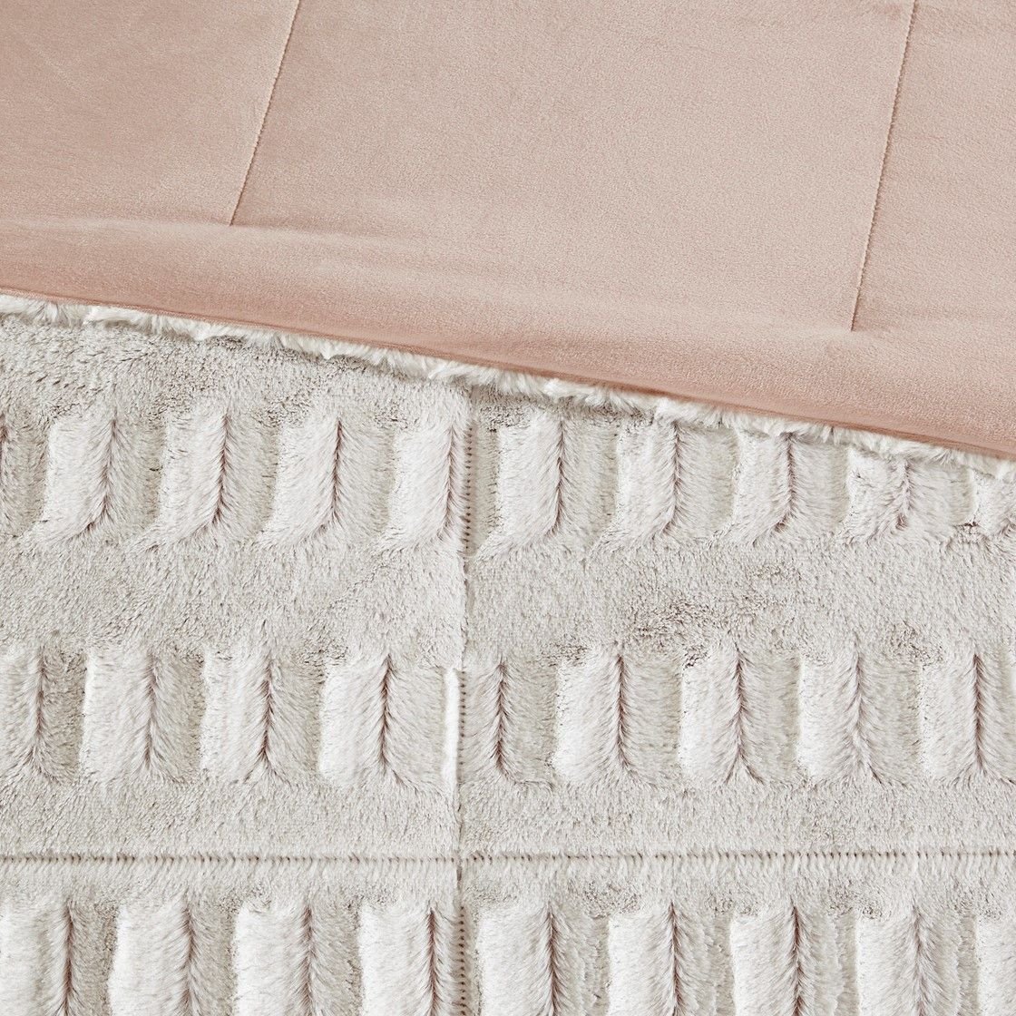 Sleep in the pure softness and comfort of the Gia Back Print Long Fur Comforter Mini Set. The ultra-soft blush comforter flaunts a stylish brushed faux fur on the face that flips to a soft faux mink reverse, for a luxurious look and feel. Matching shams (1 sham for Twin sizes) mirror the design of the comforter and feature a 2-inch flange to complete the comforter set. Hypoallergenic filling in the faux fur comforter provides exceptional warmth and comfort, while the end-to-end box stitching keeps the filling in place. Incredibly soft, this reversible long fur comforter mini set brings the perfect amount of comfort and glamorous style to your bedroom decor. This comforter set is also OEKO-TEX certified, meaning it does not contain any harmful substances or chemicals to ensure quality comfort and wellness.