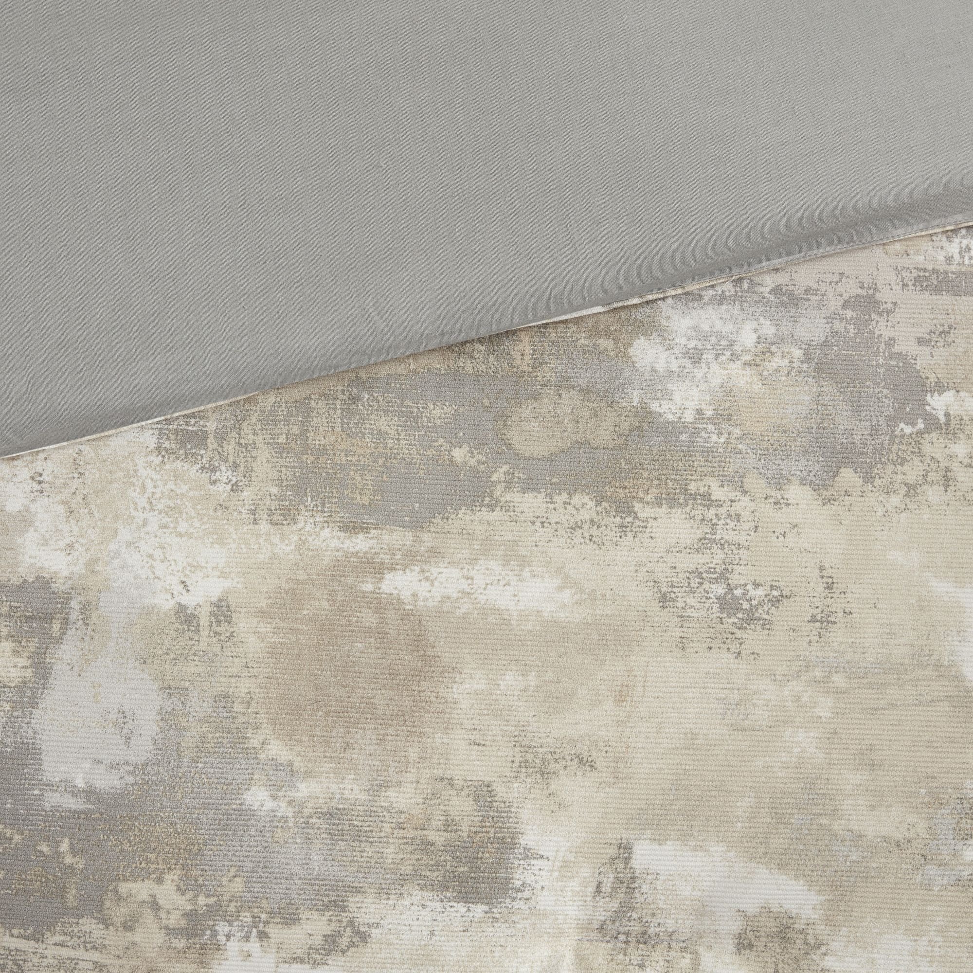 Comforter is in various gray, taupe and cream color with a solid gray reverse
