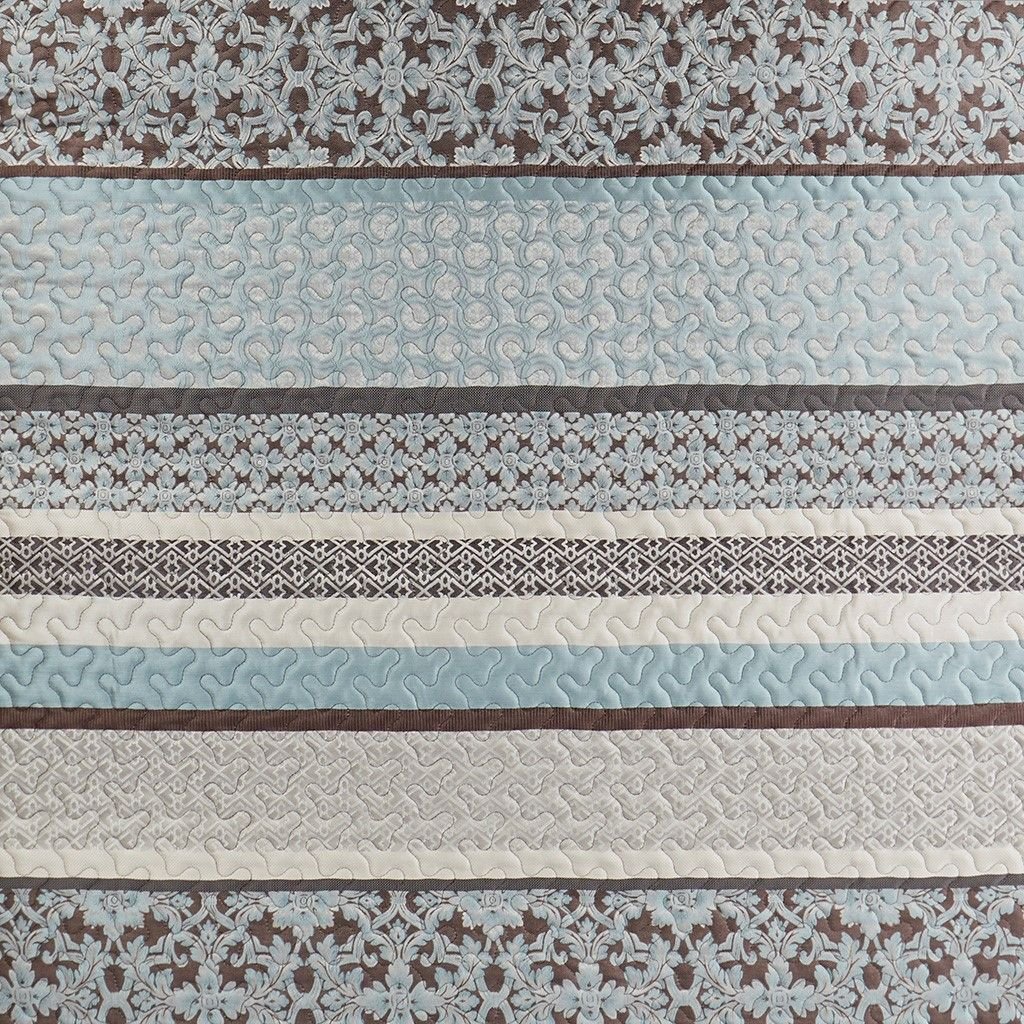 Add a touch of richness to your home decor with the Madison Park Princeton 5 Piece jacquard bedspread set. Princeton creates character with intricate geometric and damask prints in a mix of grey, ivory, and soft blue tones with solid chocolate brown border. The two matching shams repeat the design of the bedspread, and 2 decorative pillows with pleating and embroidery details pull the look together. Made from polyester jacquard and a brushed fabric reverse this comforter is soft to the touch and is machine washable for easy care.