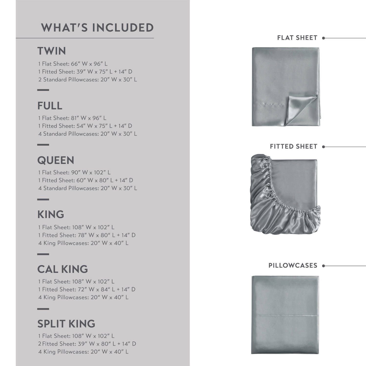 Split King1 Flat Sheet: 108"W x 102"L2 Fitted Sheets: 39"W x 80"L + 14"D (2)4 King Pillowcases: 20"W x 40"L (4)