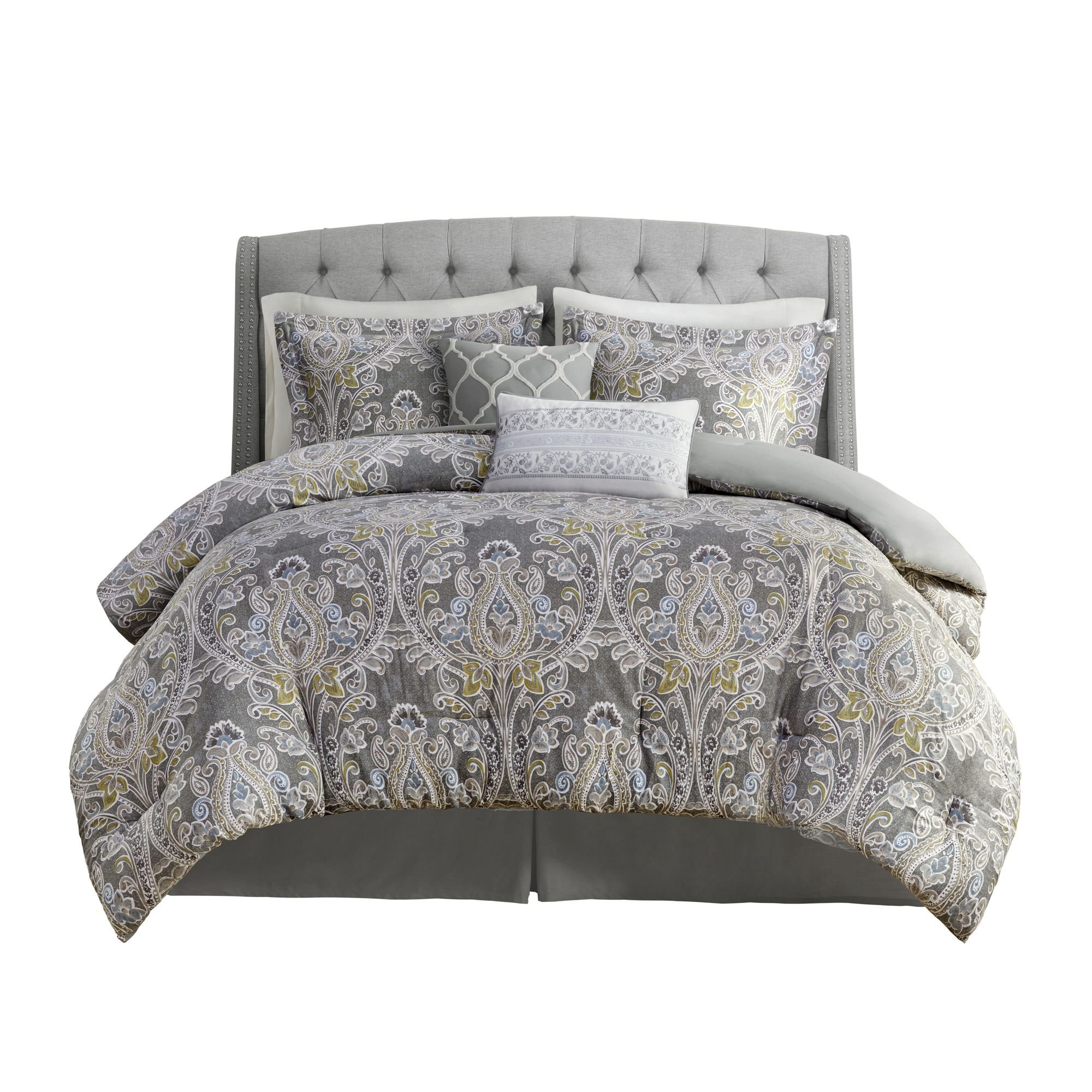 The Harbor House Hallie 6 Piece Cotton Comforter Set introduces an elegant and traditional allure to your bedroom decor. Flaunting a beautiful damask pattern in grey hues with hints of blue and yellow, the oversized and overfilled cotton comforter provides incredible softness and comfort. A solid grey reverse complements the top of the bed, while two cotton shams reiterate the damask print seen on the comforter to create a beautiful coordinated look. To complete the bedding set, two decorative pillows with embroidered details and a solid grey bed skirt provide the finishing touch. Made from soft cotton sateen, this comforter set will easily transform your bedroom into a stunning and lavish retreat. This bedding set is also OEKO-TEX certified, meaning it does not contain any harmful substances or chemicals, ensuring quality comfort and wellness. This bedding set may come in rolled or compressed packing and will need to be fluffed up. Use a steam iron to help remove wrinkles easier.