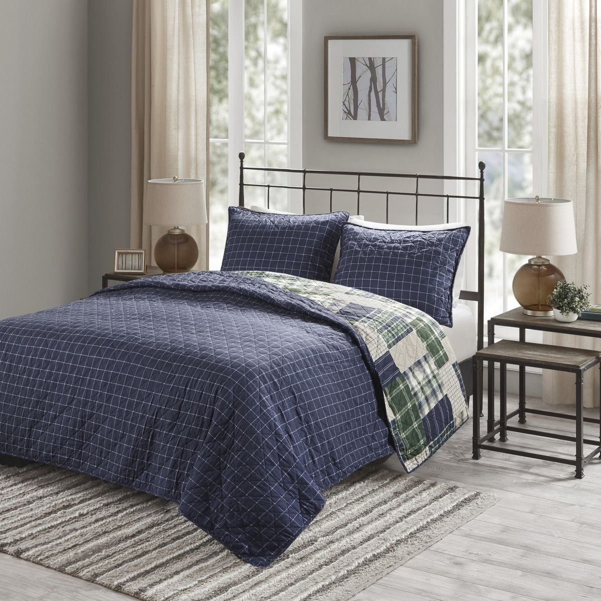 Rich in color, the Madison Park Timber 3 Piece Reversible Printed Quilt Set offers a lodge style update for your bedroom. This reversible rustic quilt features a patchwork print, in green and navy hues, for a cabin-inspired look. The navy reverse showcases a clean and inviting all-over windowpane print to complement the top of the quilt. Zipper closures on the 2 matching reversible shams create a clean finished edge, while cotton-rich filling and channel quilting provides a soft hand feel. Machine washable for easy care, this reversible quilt set brings a warm cabin look to your bedroom decor.